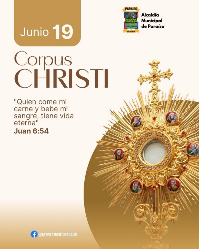 En este Día de 𝐂𝐨𝐫𝐩𝐮𝐬 𝐂𝐡𝐫𝐢𝐬𝐭𝐢, desde la Alcaldía Municipal de Paraíso nos detenemos en silencio para honrar lo que trasciende: la presencia sagrada que recorre nuestras calles y bendice nuestras vidas.