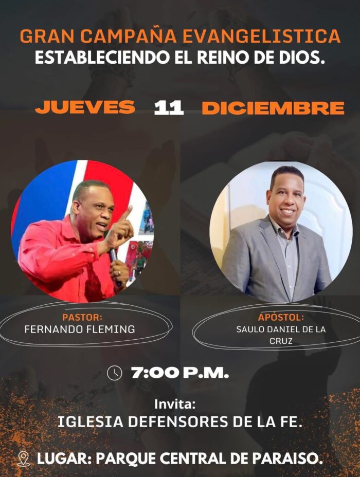 Hoy jueves 11 de diciembre, a partir de las 7:00 p.m., se estará realizando en el Parque Central de Paraíso una Gran Campaña Evangelística titulada “Estableciendo el Reino de Dios”, organizada por la Iglesia Defensores de la Fe.
