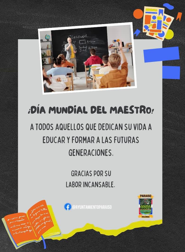 Hoy celebramos a quienes con dedicación y esfuerzo forman el futuro de nuestra sociedad. Los maestros son pilares fundamentales en el desarrollo de nuestras comunidades. Desde el Ayuntamiento de Paraíso, agradecemos y valoramos su incansable labor en la educación de nuestros niños y jóvenes. ¡Feliz Día a todos los maestros! #alcaldiaparaiso #DiaMundialDelMaestro