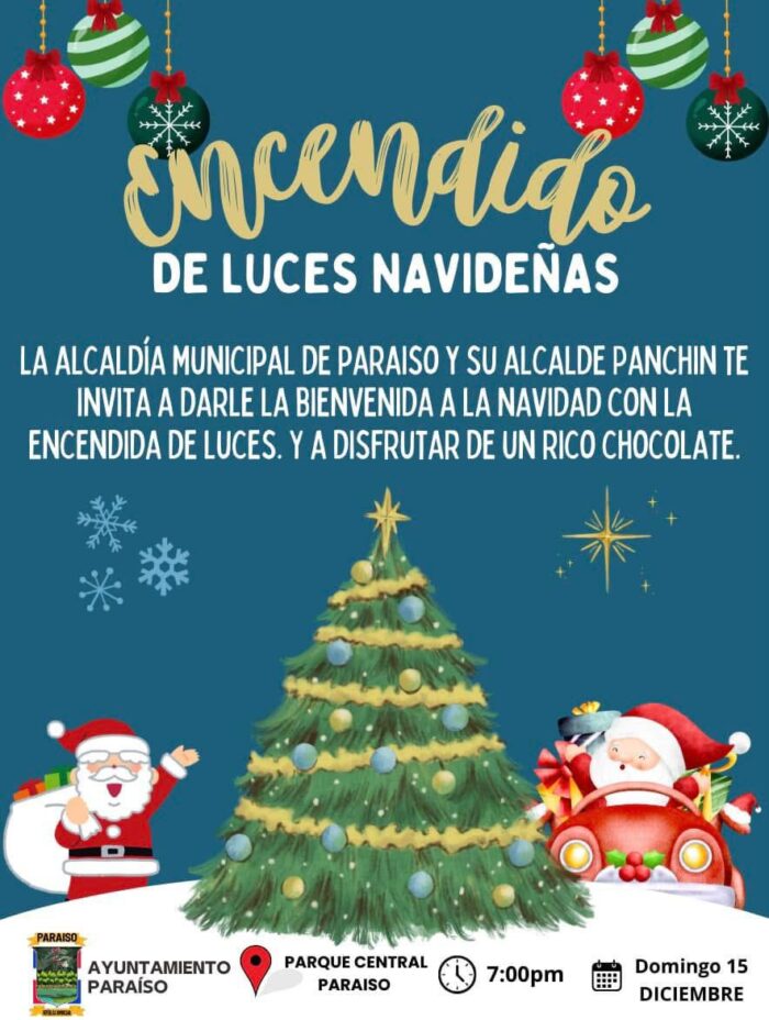 La Alcaldía de Paraíso y su alcalde Panchín te invitan a darle la bienvenida a la Navidad con el encendido de luces y un delicioso chocolate caliente. Navidad 🎄 🎅