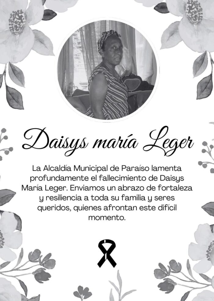 La Alcaldía Municipal de Paraíso lamenta profundamente el fallecimiento de Daisys María Leger.