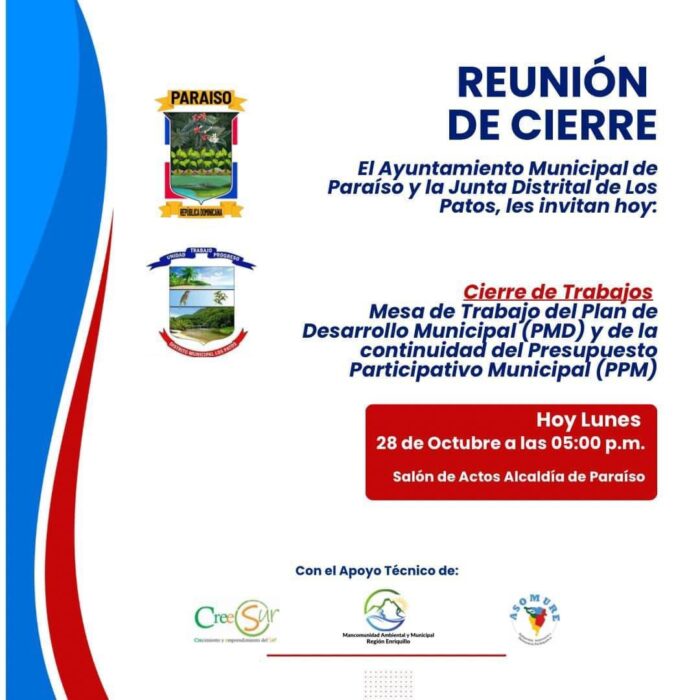 Hoy, lunes 28 de octubre a las 5:00 p.m., en el Salón de Actos de la Alcaldía de Paraíso, se concluye la Mesa de Trabajo del Plan de Desarrollo Municipal (PMD) y el Presupuesto Participativo Municipal (PPM).