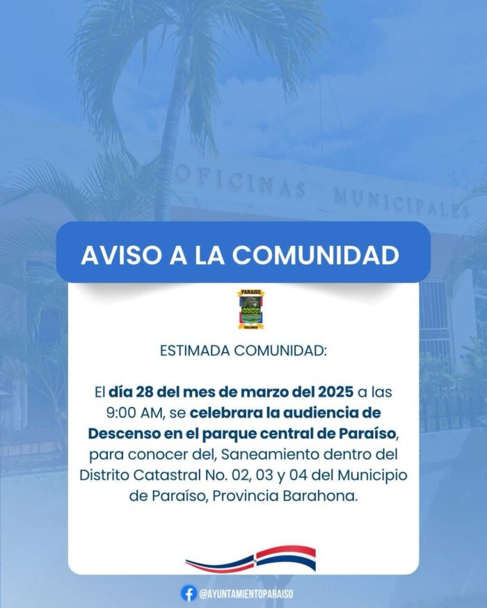 El Ayuntamiento de Paraíso informa que el próximo 28 de marzo de 2025, a las 9:00 AM, se llevará a cabo una Audiencia de Descenso en el Parque Central de Paraíso.