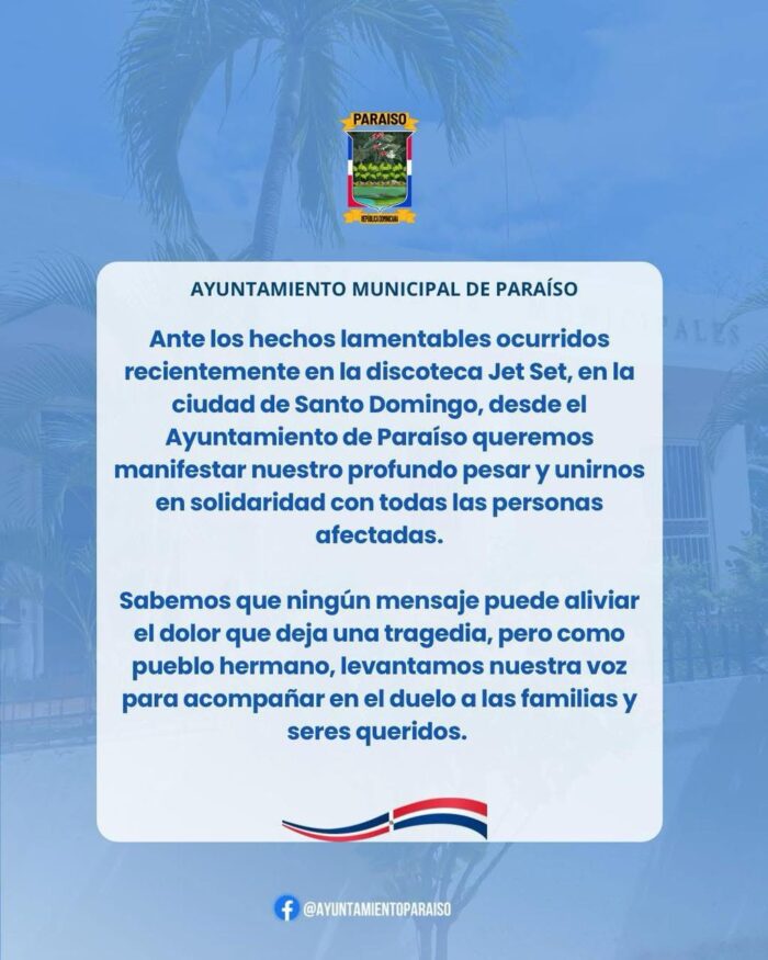 El Ayuntamiento de Paraíso expresa su solidaridad ante el lamentable hecho ocurrido en la discoteca Jet Set, en Santo Domingo.